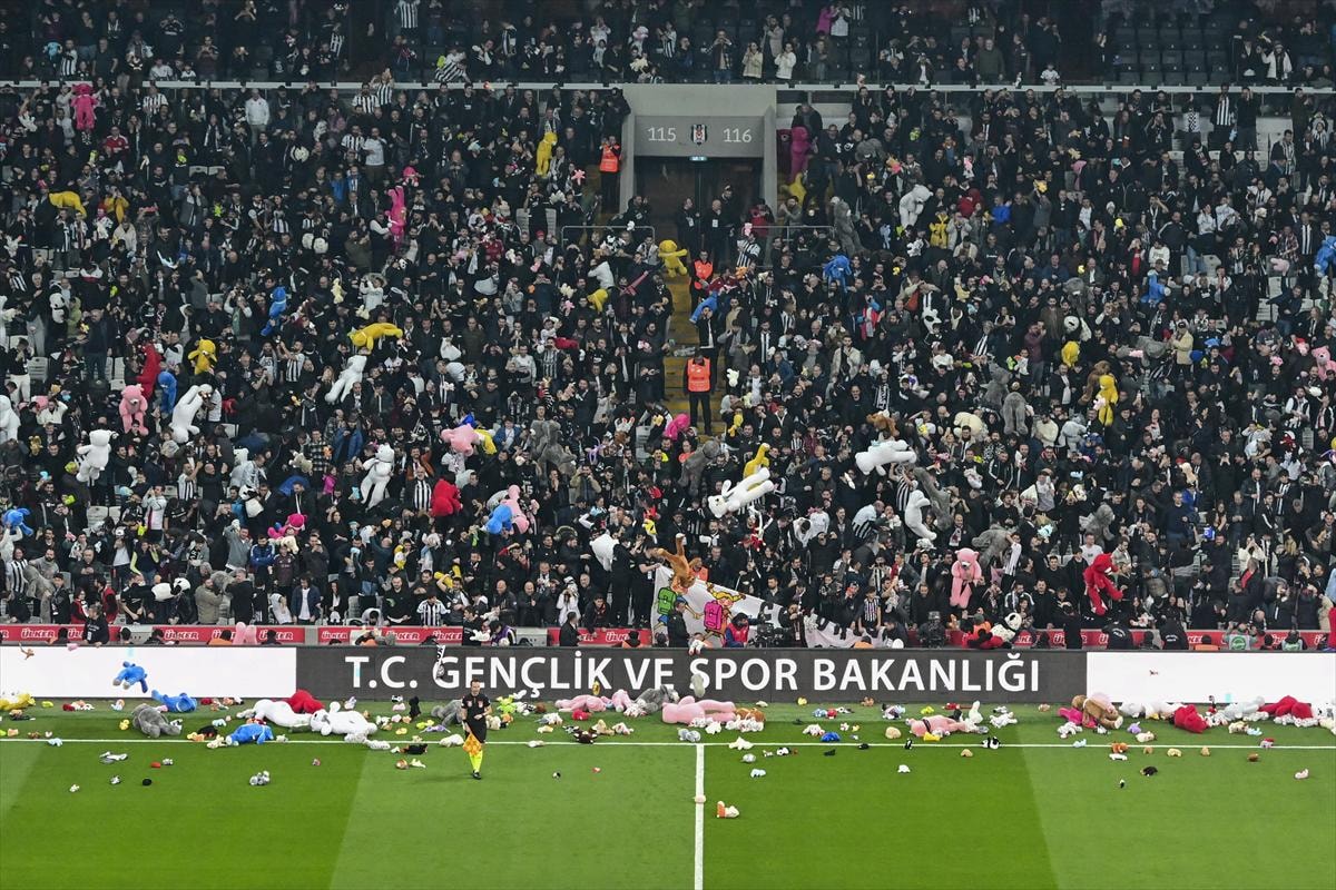 "İstanbul'da Beşiktaş ile Antalyaspor arasında oynanan maçta, Türkiye'deki depremden sağ kurtulan çocuklara bağış olarak binlerce oyuncak ayı ve pelüş oyuncaklar sahaya atıldı."