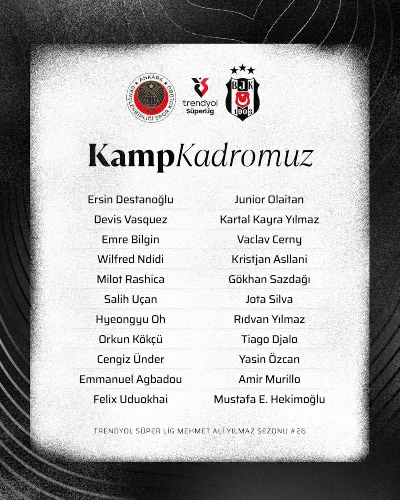 Beşiktaş'ın Gençlerbirliği maçı kadrosunda şu isimler yer aldı: