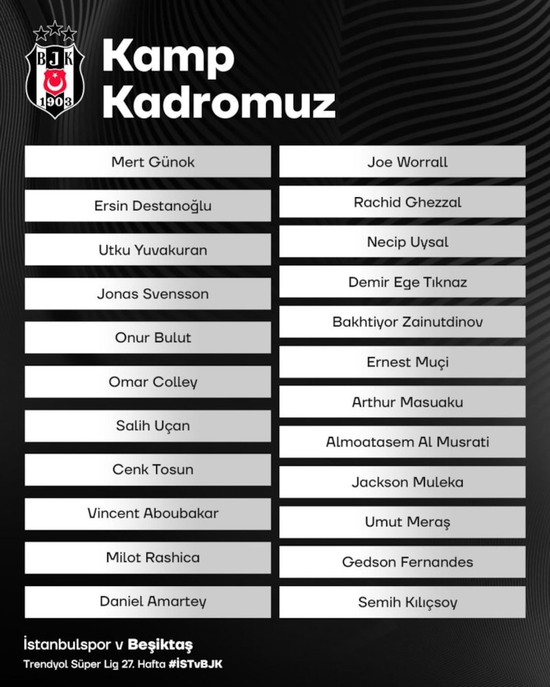 Beşiktaş, Süper Lig'in 27. haftasında karşılaşacağı İstanbulspor maçının kamp kadrosunu duyurdu.