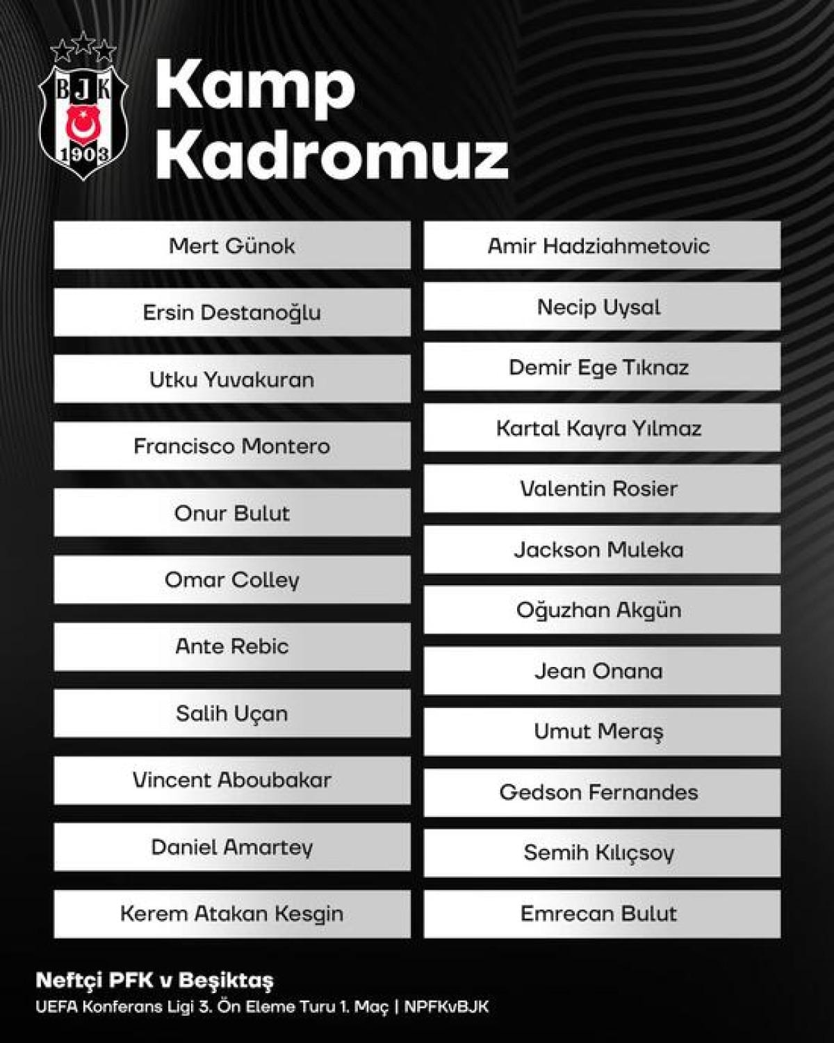 Beşiktaş UEFA Konferans Ligi'nde karşılaşacağı Neftçi Bakü maçının kamp kadrosunu açıkladı.