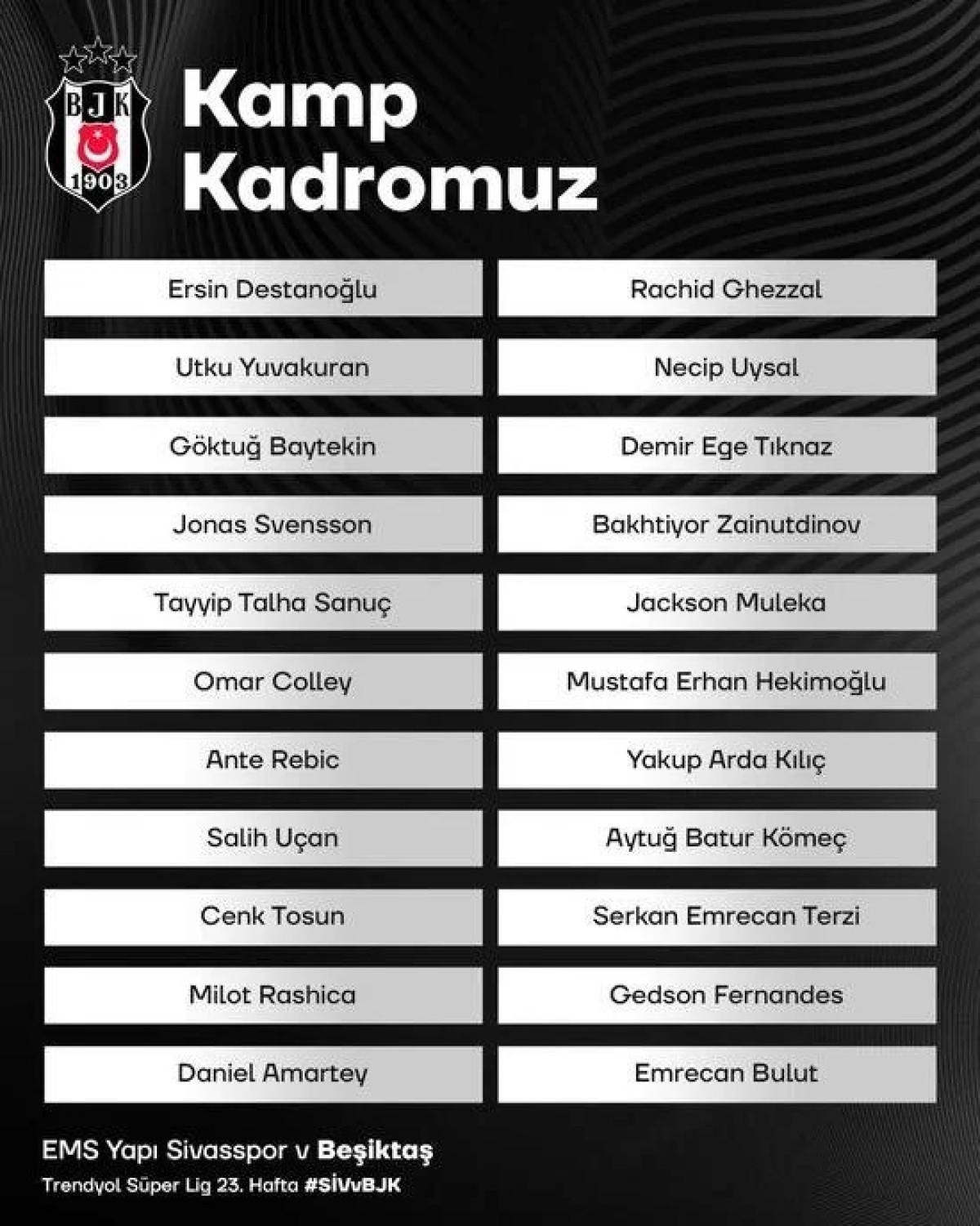 Kadroda sakatlığı bulunan Semih Kılıçsoy ve Pendikspor'a transfer olacağı konuşulan Onur Bulut yer almadı. Açıklamada Onur'un ağrılarının arttığı bilgisine de yer verildi.