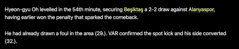 "Celtic'in eski forveti Hyeon-Gyu Oh, Beşiktaş formasıyla çıktığı ilk maçta muhteşem bir röveşata golüne imza attı. Güney Koreli golcünün golü ilk anda ofsayt gerekçesiyle iptal edilse de VAR incelemesi sonrası geçerli sayıldı. Beşiktaş, Alanyaspor karşısında 2-0 geriye düştüğü maçta Oh Hyeon-Gyu’nun golüyle 2-2’lik beraberliği yakalayarak geri dönüşü tamamladı. 24 yaşındaki forvet, yeni takımındaki ilk maçında attığı bu golle “anında etki” yarattı."