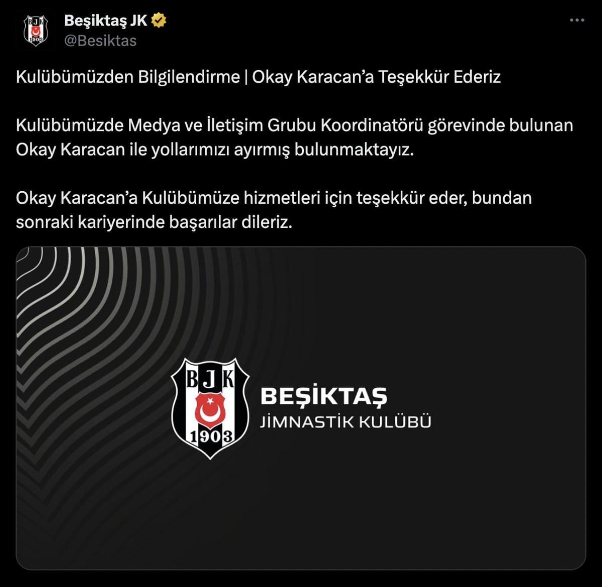 Beşiktaş, Medya ve İletişim Grubu Koordinatörü Okay Karacan ile yolların ayrıldığını açıkladı.