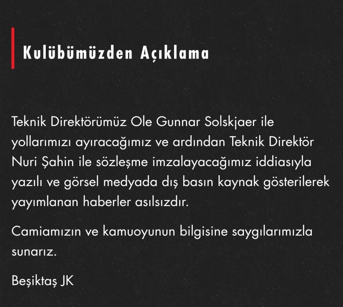 Teknik Direktörümüz Ole Gunnar Solskjaer ile yollarımızı ayıracağımız ve ardından Teknik Direktör Nuri Şahin ile sözleşme imzalayacağımız iddiasıyla yazılı ve görsel medyada dış basın kaynak gösterilerek yayımlanan haberler asılsızdır.