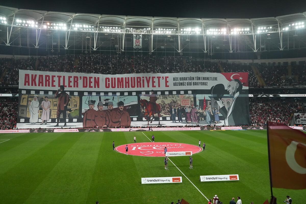 Stadyumu dolduran futbolseverler, Cumhuriyet'in 100. kuruluş yıl dönümü için hazırladıkları pankartı sergiledi.