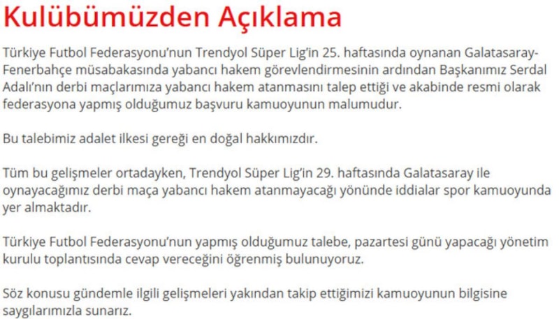 Türkiye Futbol Federasyonu’nun Trendyol Süper Lig’in 25. haftasında oynanan Galatasaray-Fenerbahçe müsabakasında yabancı hakem görevlendirmesinin ardından Başkanımız Serdal Adalı’nın derbi maçlarımıza yabancı hakem atanmasını talep ettiği ve akabinde resmi olarak federasyona yapmış olduğumuz başvuru kamuoyunun malumudur.