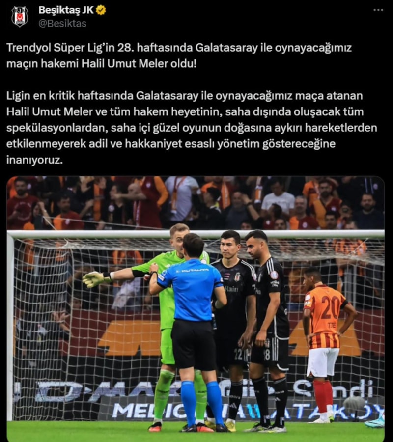 Beşiktaş Kulübü, Galatasaray ile Dolmabahçe'de oynanacak derbiyi yönetecek hakem Halil Umut Meler ile ilgili sosyal medya hesabından bir paylaşım yaptı.