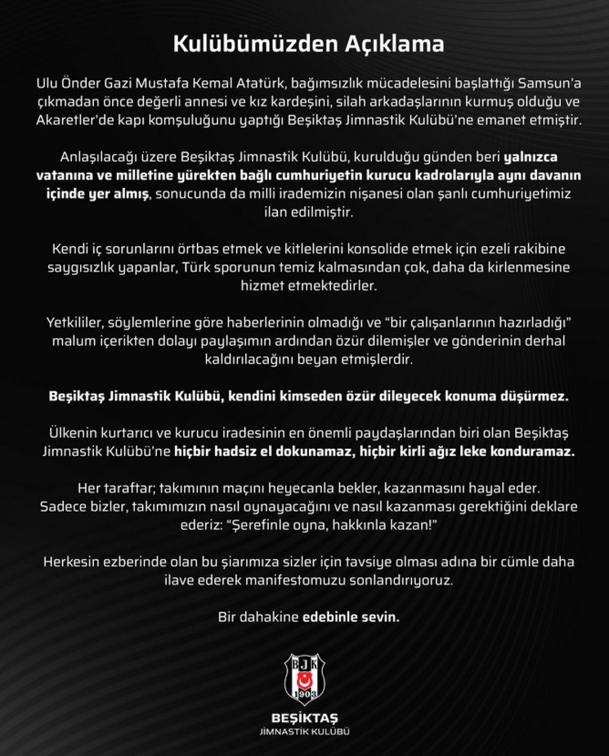 Beşiktaş Jimnastik Kulübü, kendini kimseden özür dileyecek konuma düşürmez. Ülkenin kurtarıcı ve kurucu iradesinin en önemli paydaşlarından biri olan Beşiktaş Jimnastik Kulübü'ne hiçbir hadsiz el dokunamaz, hiçbir kirli ağız leke konduramaz.