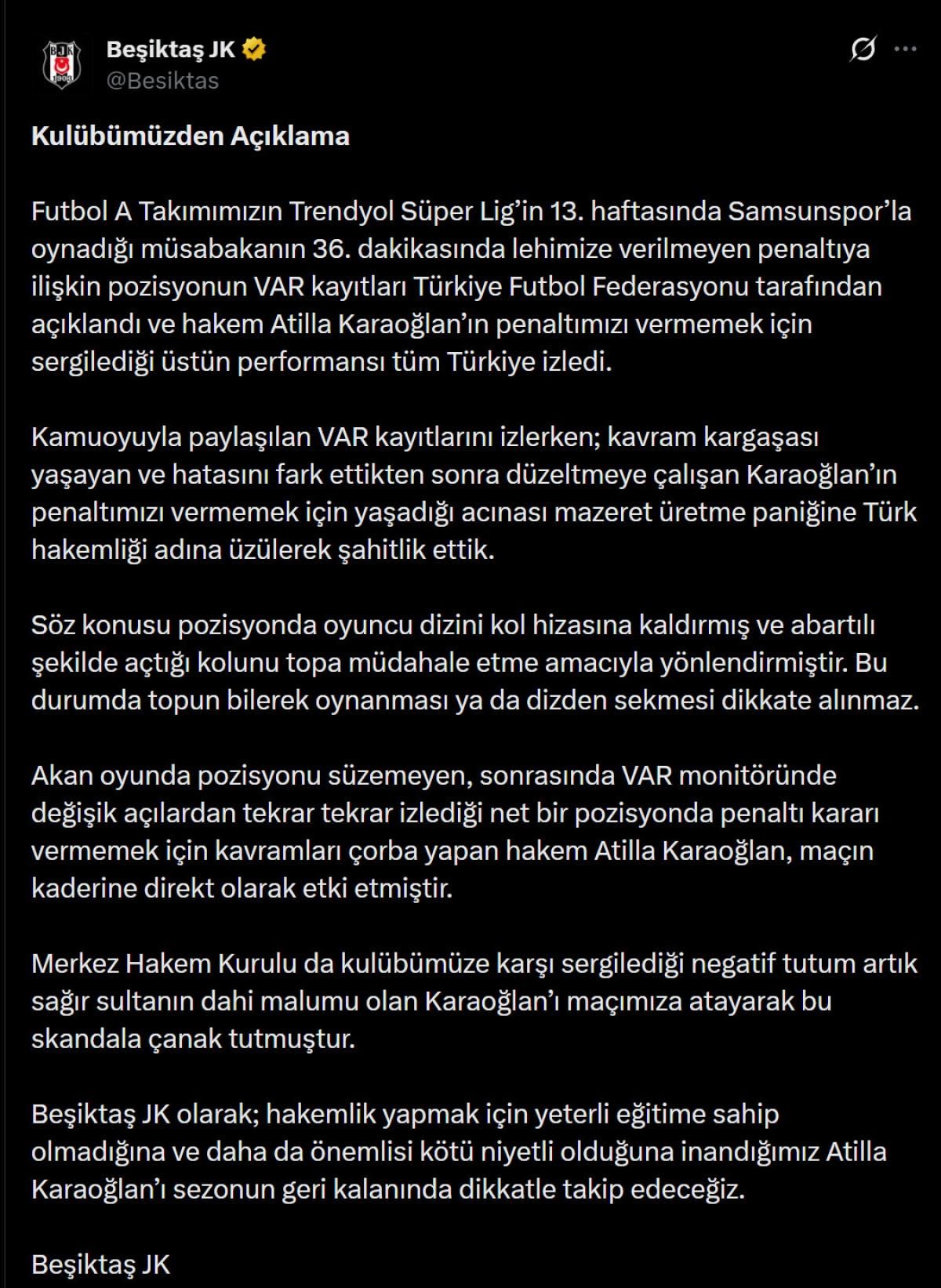 TFF'nin kayıtları yayınlamasının ardından ise Beşiktaş Kulübü, maçı yöneten hakem Atilla Karaoğlan'a resmi hesabından tepki gösterdi.