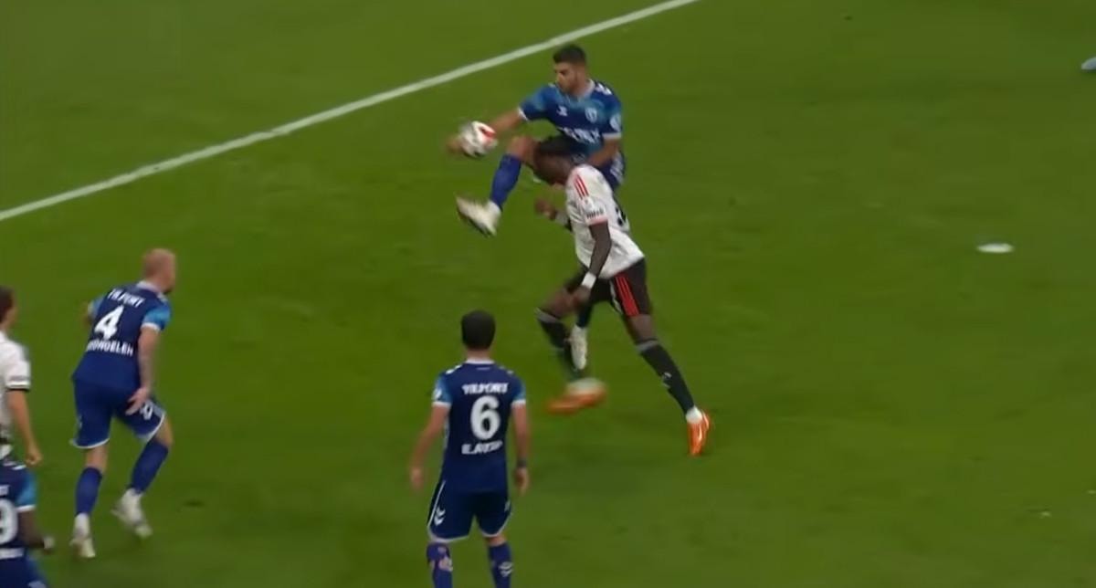Hakem Atilla Karaoğlan, "Sağ koluna teması gördüm. Başka bir açı gösterir misin? Tekme mi bu bilerek oynama mı ona bir bakacağım. Ben oynuyor olarak görüyorum. Sağ ayağıyla oynuyor, daha sonra sağ eline geliyor" yorumunu yaptı.