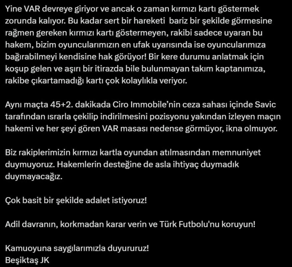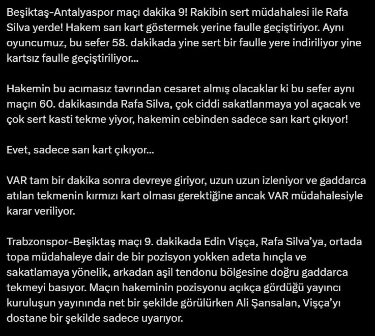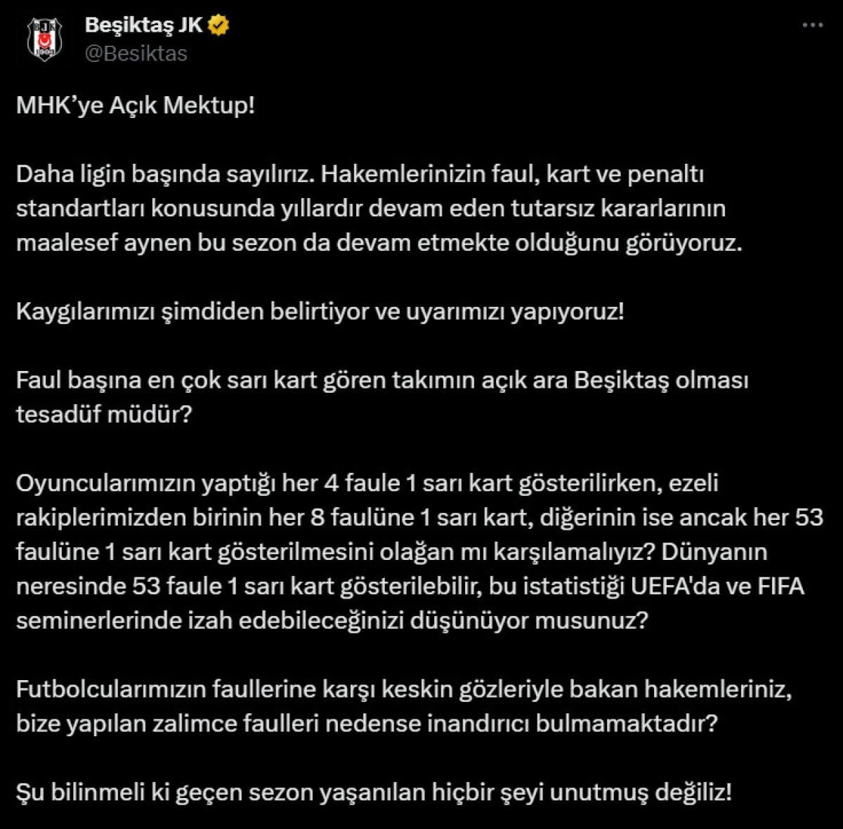 Resmi hesaptan yapılan paylaşımda Merkez Hakem Kurulu hedef alınarak, "MHK'ye Açık Mektup! Faul başına en çok sarı kart gören takımın açık ara Beşiktaş olması tesadüf müdür?" denildi.