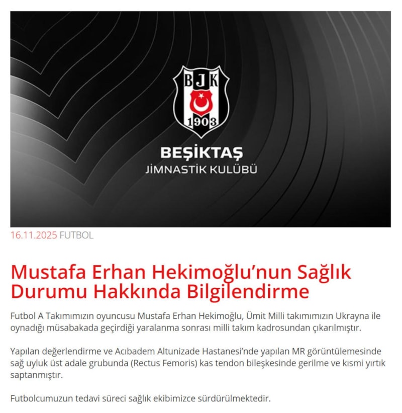 Siyah-beyazlı kulüpten yapılan açıklamada, "Futbol A takımımızın oyuncusu Mustafa Erhan Hekimoğlu, Ümit Milli Takımımızın Ukrayna ile oynadığı müsabakada geçirdiği yaralanma sonrası milli takım kadrosundan çıkarılmıştır. Yapılan değerlendirme ve sponsor hastenmizde yapılan MR görüntülemesinde sağ uyluk üst adale grubunda (Rectus Femoris) kas tendon bileşkesinde gerilme ve kısmi yırtık saptanmıştır." ifadelerine yer verildi.