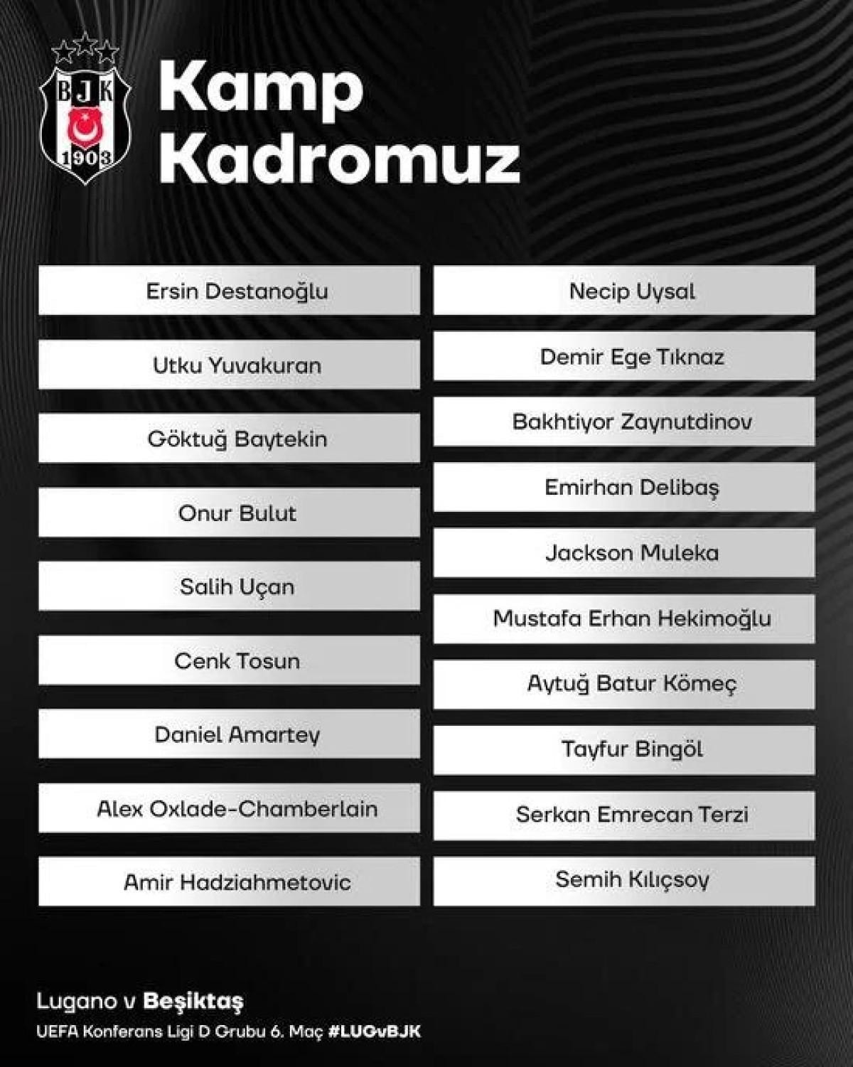 Sol dizinde eklem içi sıvı artışı olan Mert Günok, sağ dizinde arka kapsüler yaralanması tedavisi devam eden Omar Colley, sol alt adale sakatlığından dolayı tedavisi süren ve ayak bileğinde bağ yaralanması olan Gedson Fernandes, besin zehirlenmesi ve gastroenterit nedeniyle tedavi altında olan Ante Rebic, sahaya dönüş çalışmalarına devam eden; Arthur Masuaku, Milot Rashica ve Yakup Arda Kılıç, Futbol A Takımımızın UEFA Konferans Ligi'nde Lugano ile oynayacağı maçın kadrosunda yer almayacaktır.