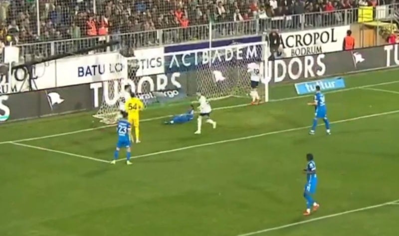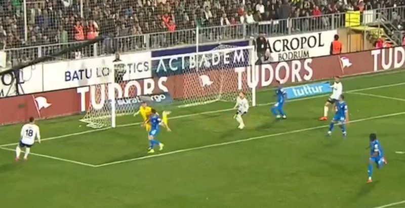 36'ncı dakikada Fenerbahçe'nin sağ kanattan geliştirdiği hücumda İrfan Can Kahveci ortasını yaptı. Bodrum FK'da kalesini terk eden Rüzgar Mehmet Adıyaman topu tek yumrukla uzaklaştırmak istedi.