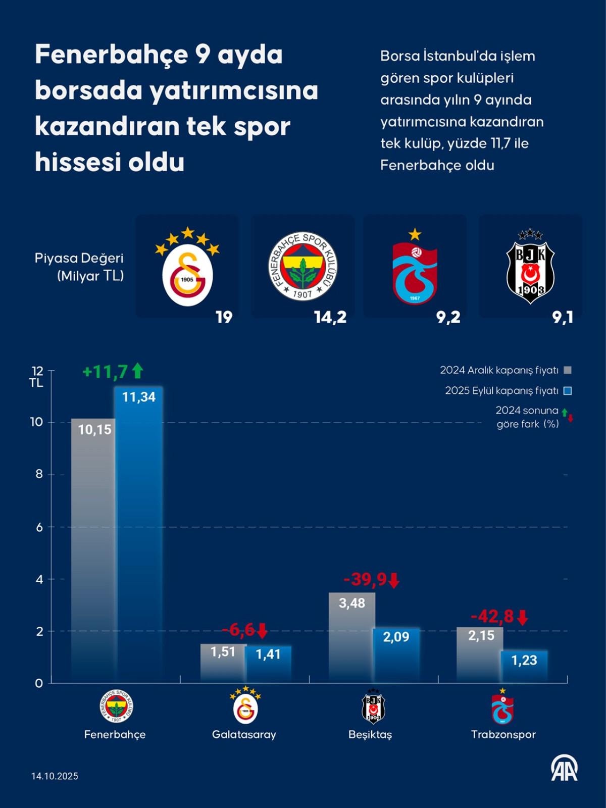 - Borsa İstanbul'da işlem gören spor kulüpleri arasında yılın ilk 9 ayında yatırımcısına kazandıran tek kulüp Fenerbahçe oldu.