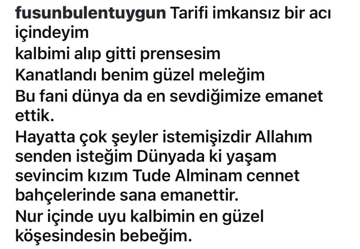 "Tarifi imkansız bir acı içindeyim, kalbimi alıp gitti prensesim. Kanatlandı benim güzel meleğim. Bu fani dünyada en sevdiğimize emanet ettim. Hayatta çok şeyler istemişizdir Allah'ım senden isteğim, dünyadaki yaşam sevincim kızımı Tude Almina'mı cennet bahçelerinde sana emanet ettim. Nur içinde uyu benim güzel kızım, kalbimin en güzel köşesindesin benim bebeğim.''