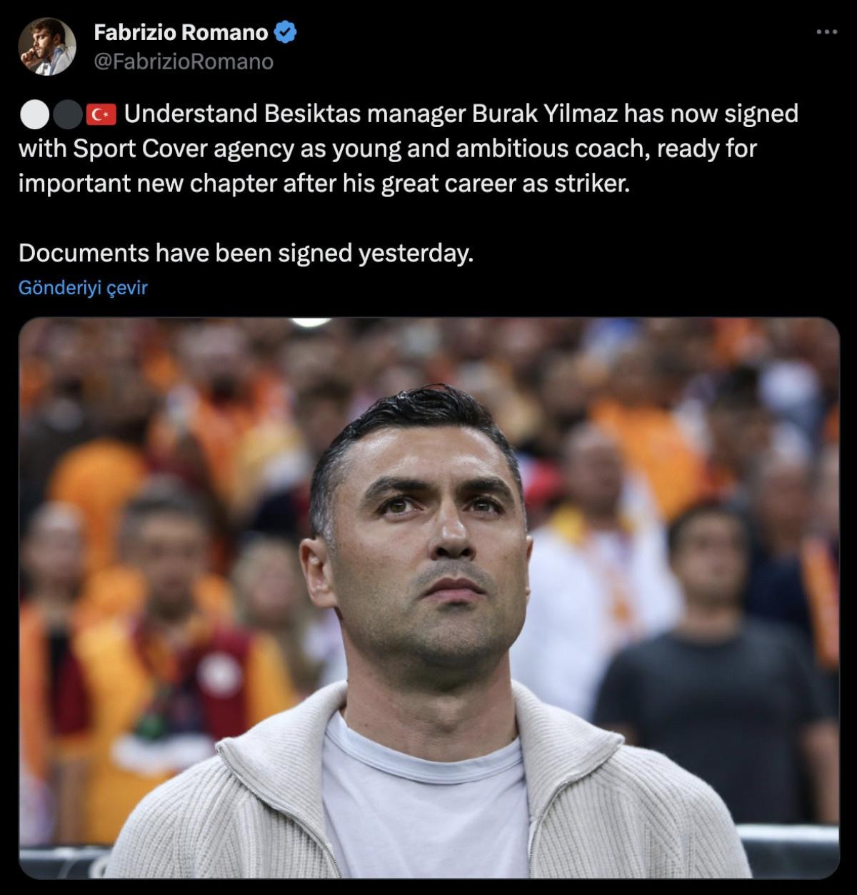 İtalyan gazeteci Fabrizio Romano'nun haberine göre; Beşiktaş'ta Şenol Güneş'in ayrılışı sonrası olağanüstü seçimli genel kurula kadar takımın başında olmasına karar verilen Burak Yılmaz menajerlik şirketi olan Sport Cover ile sözleşme imzaladı.