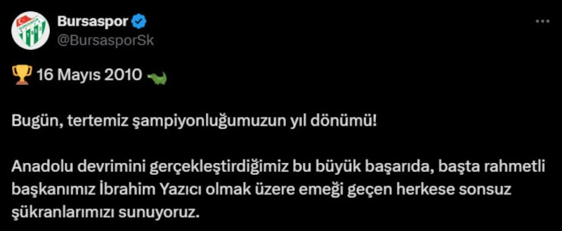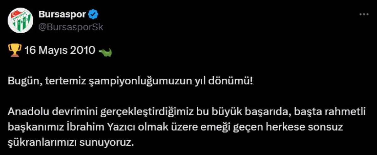 Bursaspor Kulübü, ’16 Mayıs 2010’ başlıklı paylaşımında şu ifadelere yer verdi: