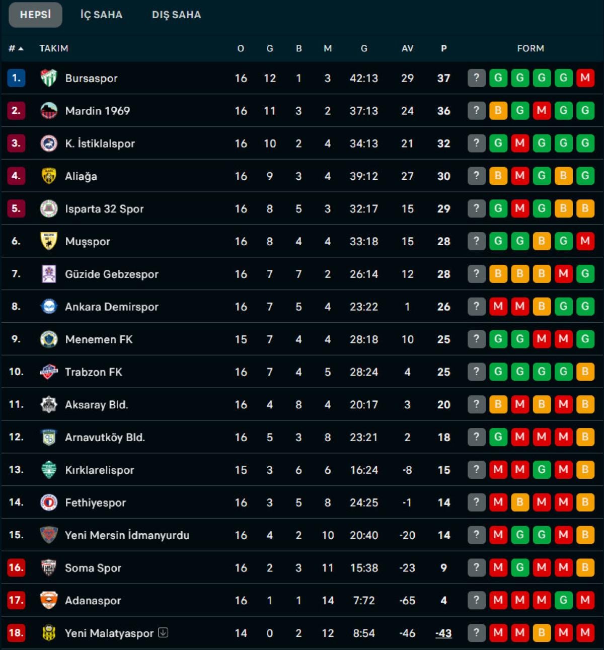 Son olarak ligin 16. haftasında Somaspor deplasmanında 3 puanı 3 golle alan yeşil-beyazlılar, Mardin 1969 Spor'un kendi sahasında puan kaybetmesiyle liderlik koltuğuna oturdu.
