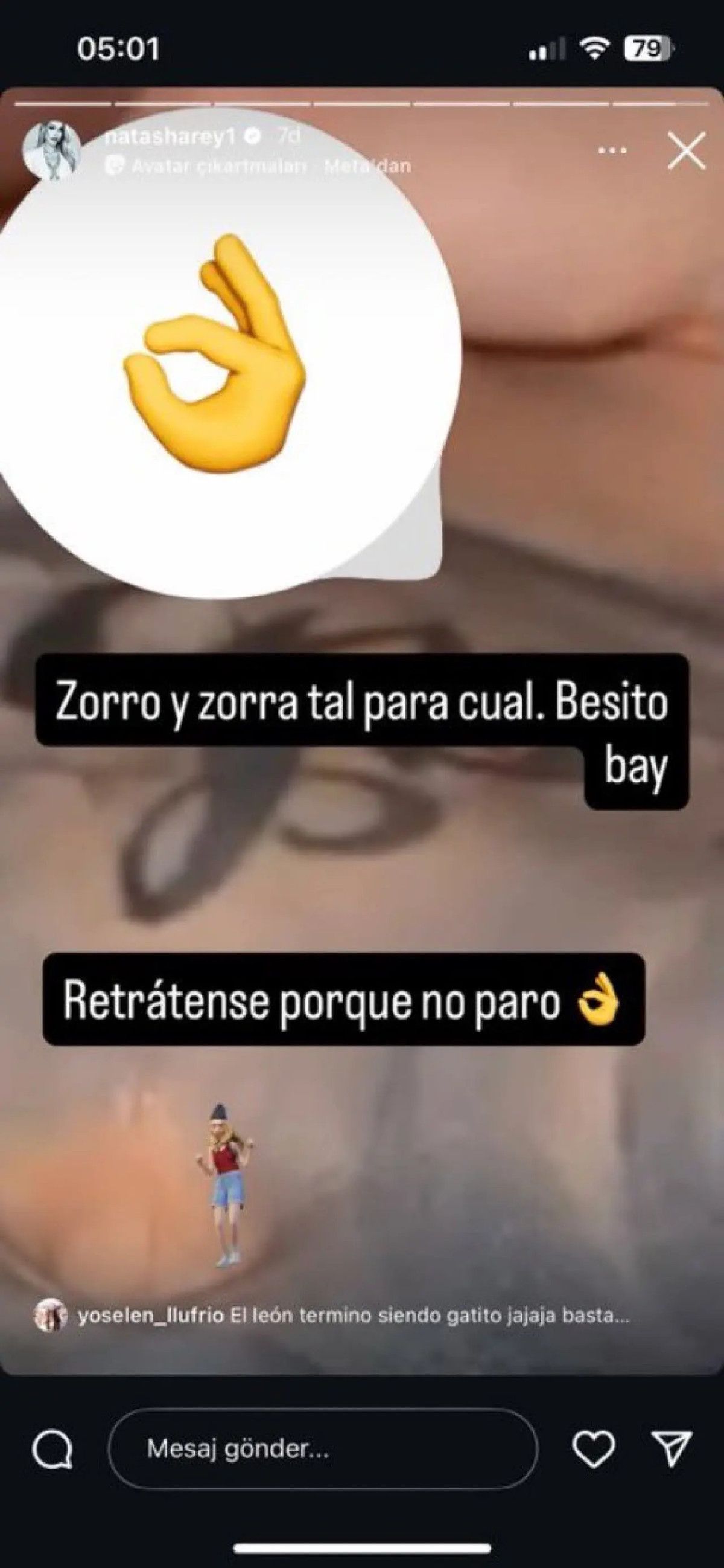 "Bu muymuş benim sözde sevgilim? Mesajlarını asla kabul etmedim, bana kendiliğinden çıplak videolarını gönderdi. Yalan söylemeyi ve benim adımı kullanarak prim yapmaya çalışmayı bırakın. Elimde her zaman olduğu gibi kanıtlar var. Ekran görüntülerini paylaşmak isterdim ama çıplak içerik nedeniyle Instagram hesabım kapatılabilir. Öpücükler… Benimle oyun oynamayın, buraları yakarım!"