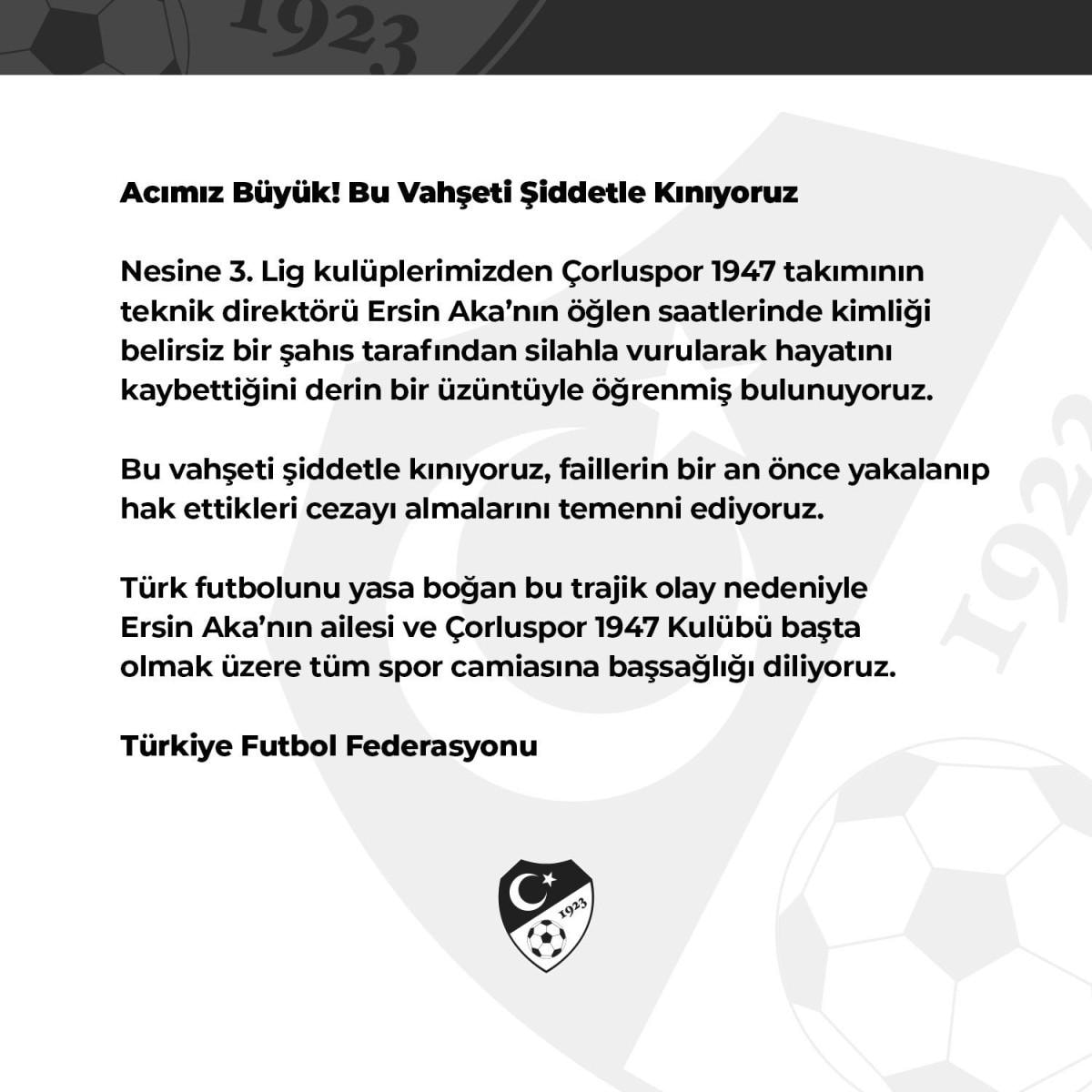 3. Lig kulüplerimizden Çorluspor 1947 takımının teknik direktörü Ersin Aka'nın öğlen saatlerinde kimliği belirsiz bir şahıs tarafından silahla vurularak hayatını kaybettiğini derin bir üzüntüyle öğrenmiş bulunuyoruz. Bu vahşeti şiddetle kınıyoruz, faillerin bir an önce yakalanıp hak ettikleri cezayı almalarını temenni ediyoruz.