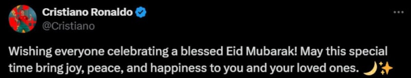 Suudi Arabistan ekibi Al Nassr'ın Portekizli yıldızı Cristiano Ronaldo, X hesabından yaptığı paylaşımda "Herkese mübarek bir Ramazan Bayramı diliyorum! Bu özel zamanın size ve sevdiklerinize neşe, huzur ve mutluluk getirmesini dilerim" ifadelerini kullandı.