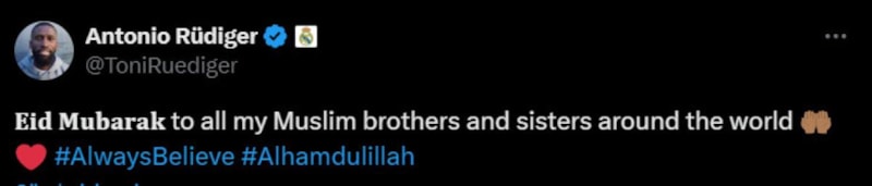 Real Madrid'in tecrübeli stoperi Antonio Rüdiger de yaptığı paylaşımda "Tüm müslüman kardeşlerime hayırlı bayramlar dilerim" dedi.