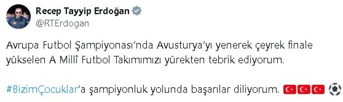 Avrupa Futbol Şampiyonası'nda Avusturya'yı yenerek çeyrek finale yükselen A Milli Futbol Takımımızı yürekten tebrik ediyorum. 'Bizim Çocuklar'a şampiyonluk yolunda başarılar diliyorum.