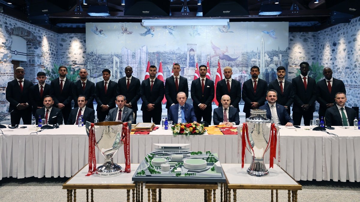 Cumhurbaşkanı Recep Tayyip Erdoğan, 2024-2025 sezonunda Trendyol Süper Lig'de ve Türkiye Kupası'nda şampiyon olan Galatasaray'ın heyetini, Cumhurbaşkanlığı Dolmabahçe Çalışma Ofisi'nde kabul etti.