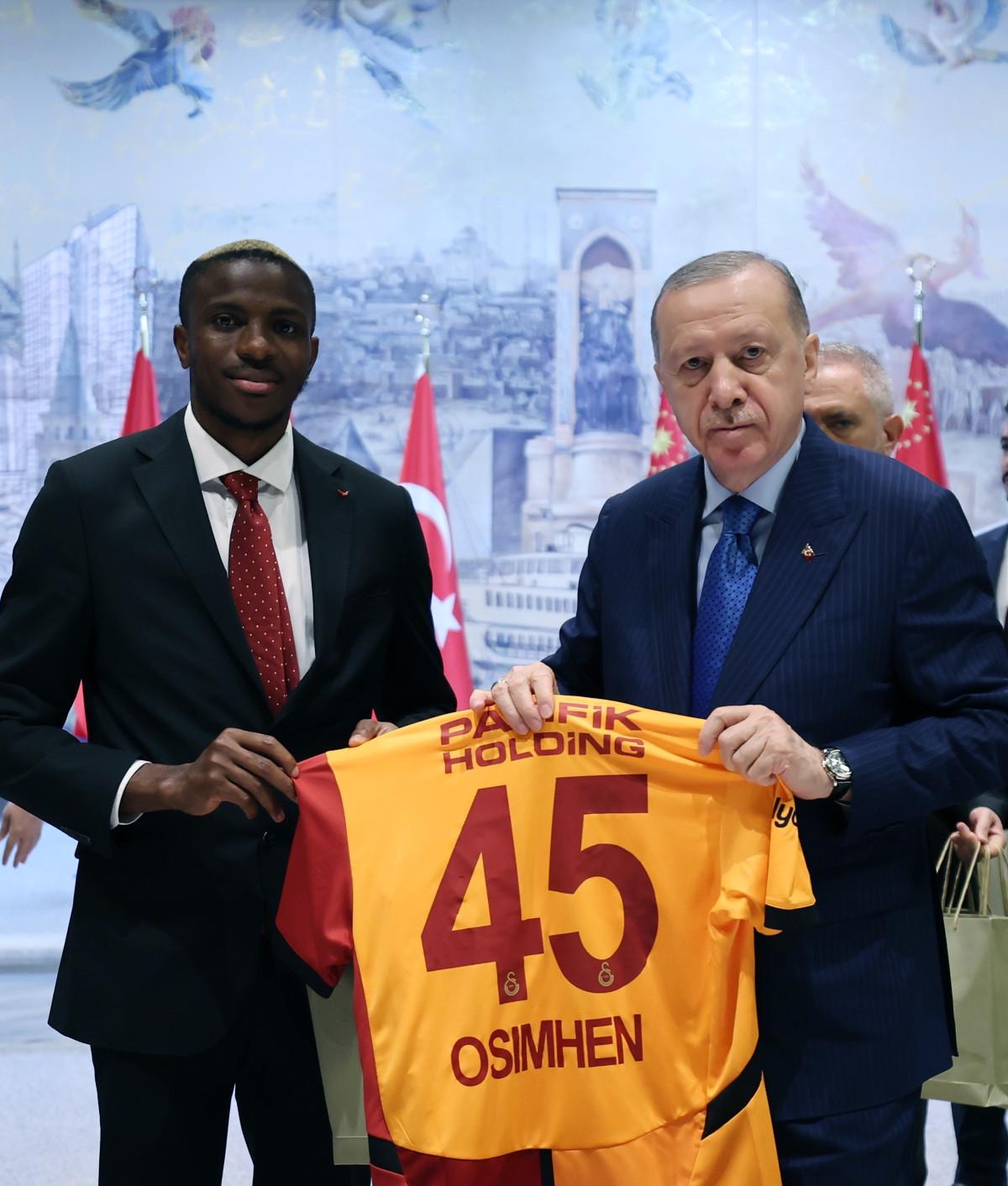 Galatasaray Başkanı Dursun Özbek, yönetim kurulu üyeleri, Teknik Direktör Okan Buruk ve futbolcularla tek tek tokalaşan Cumhurbaşkanı Erdoğan, sarı-kırmızılıların şampiyonluklarını tebrik etti.