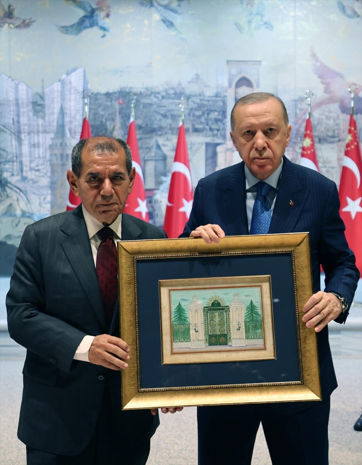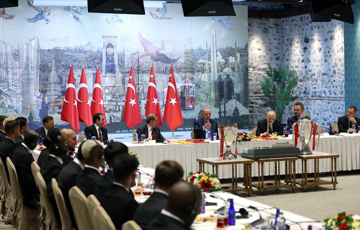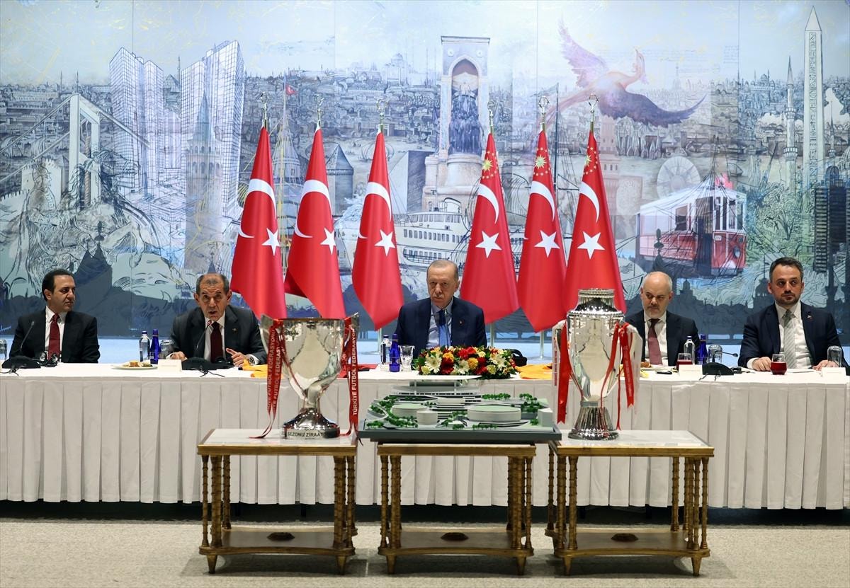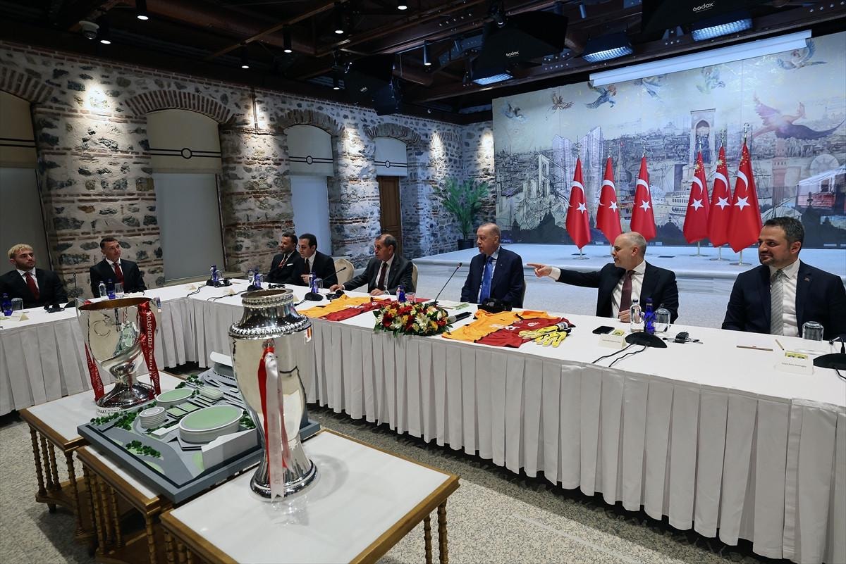 Erdoğan, sezonu Süper Lig ve Türkiye Kupası şampiyonluğuyla noktalayan Galatasaray'ı Dolmabahçe Çalışma Ofisi'nde kabul etti.