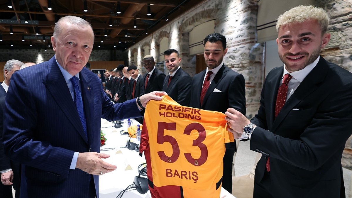 Galatasaraylı milli futbolcu Barış Alper Yılmaz, Cumhurbaşkanı Erdoğan'a isminin yazılı olduğu Galatasaray formasını hediye etti.