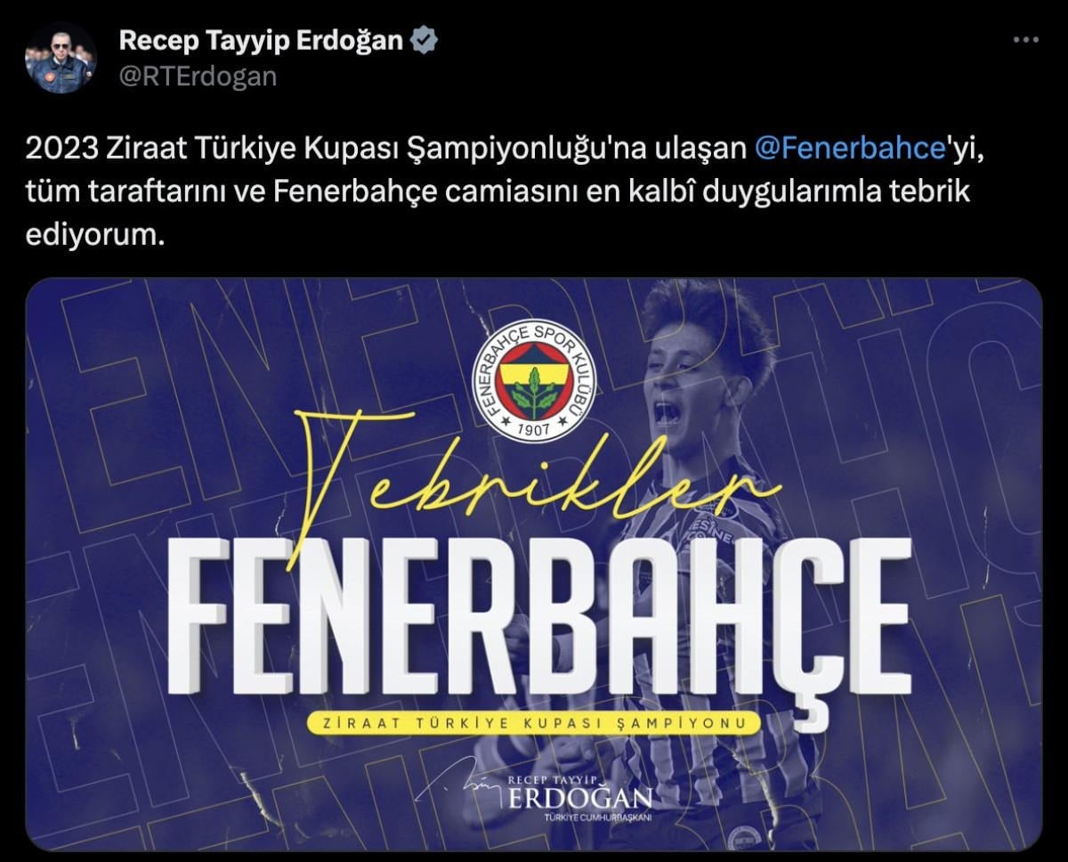 Cumhurbaşkanı Recep Tayyip Erdoğan, sosyal medya hesabından yaptığı paylaşımda, "2023 Ziraat Türkiye Kupası Şampiyonluğu'na ulaşan Fenerbahçe'yi, tüm taraftarını ve Fenerbahçe camiasını en kalbi duygularımla tebrik ediyorum" ifadelerini kullandı.