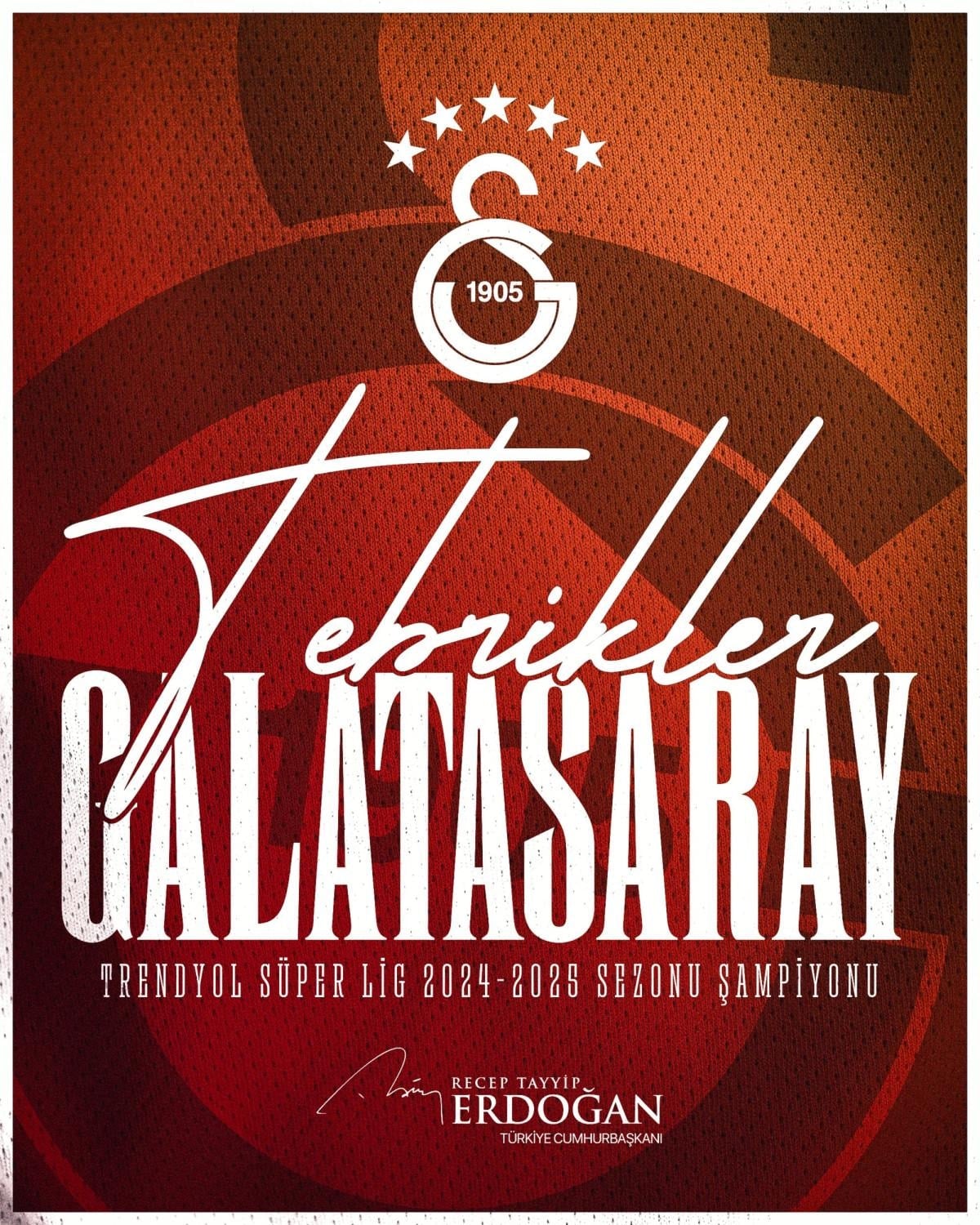 Cumhurbaşkanı Erdoğan sosyal medya hesabından yayınladığı mesajda, "2024-2025 Süper Lig Şampiyonu olan Galatasaray futbol takımını, teknik heyetini ve tüm Galatasaray Spor Kulübü camiasını yürekten tebrik ediyorum." ifadelerine yer verdi.