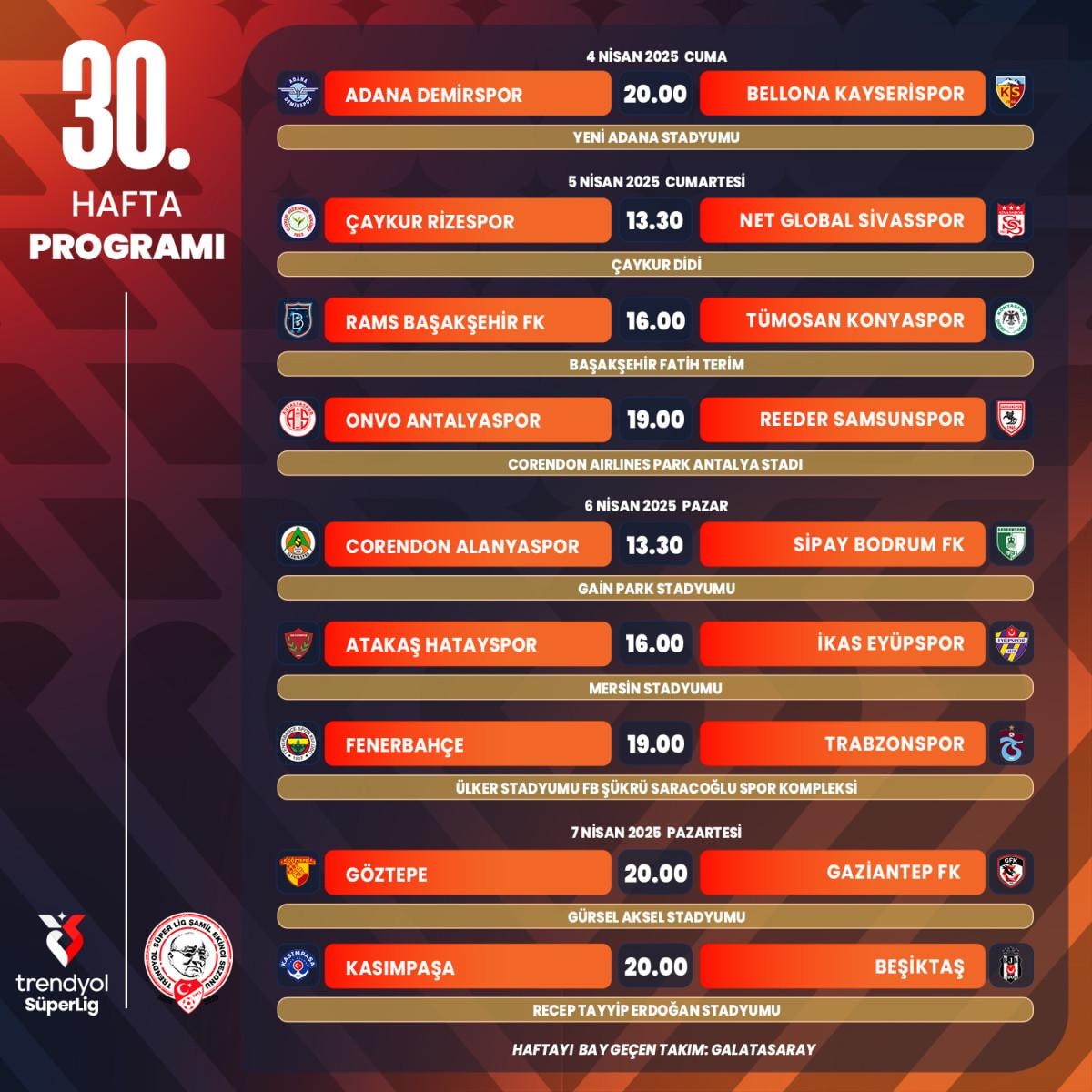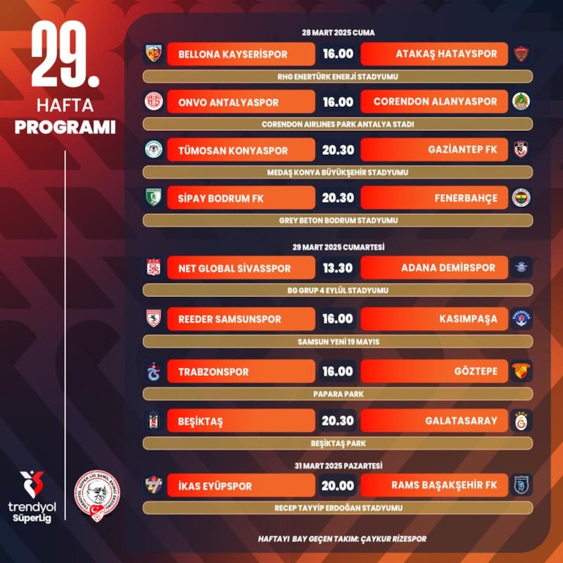 Öte yandan ligin 29. haftasını Rizespor, 30. haftasını da Galatasaray BAY geçecek.