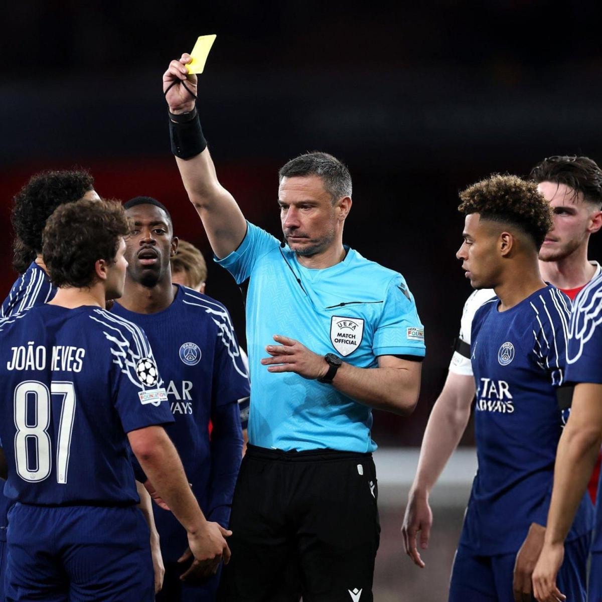 43. dakikada Saka, Mendes'ten topu kaptıktan sonra ceza sahasına girerken PSG lehine faul kararı verildi. Bu karara çok sinirlenen Saka itirazlarına devam etti ve sarı kart gördü.