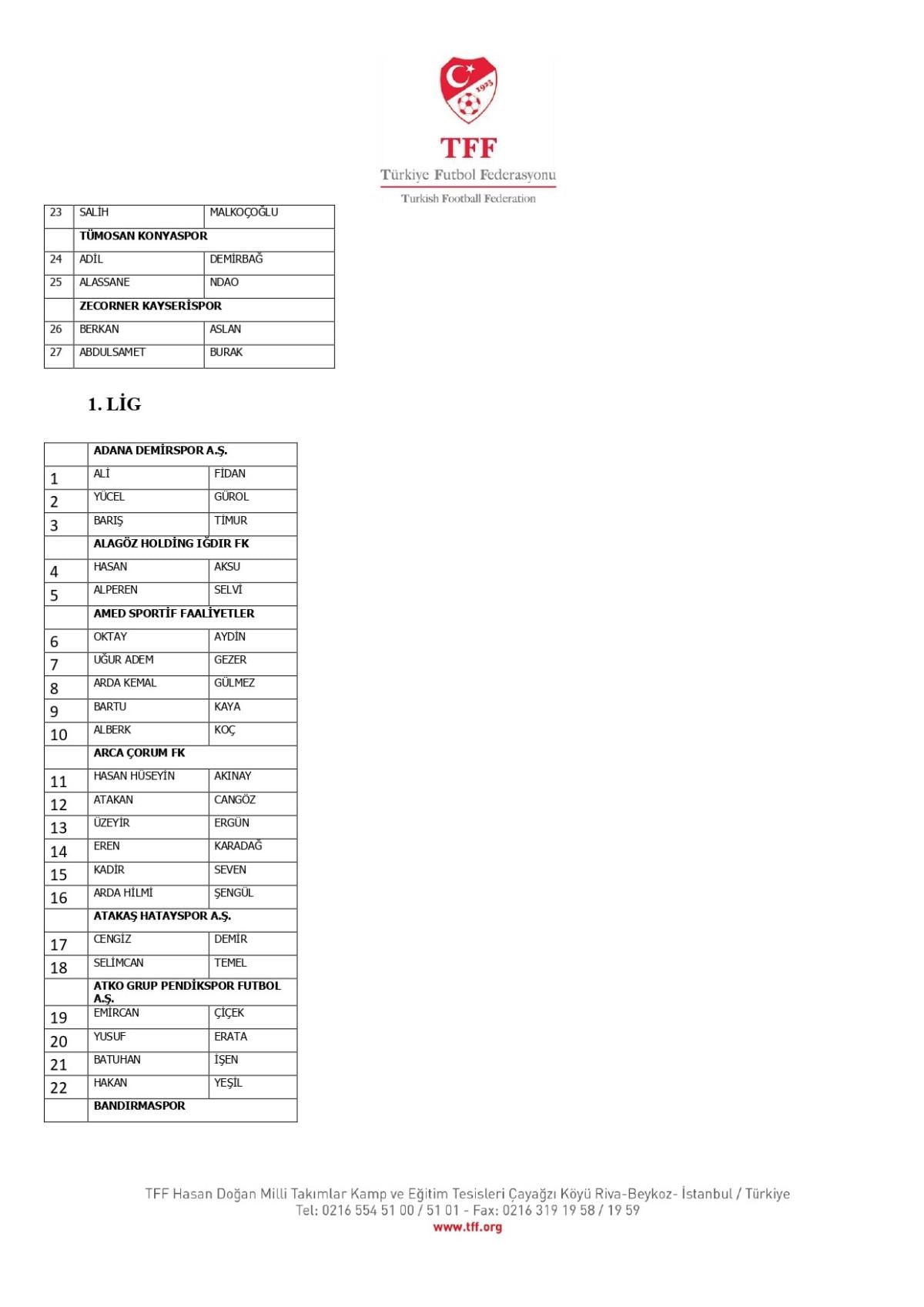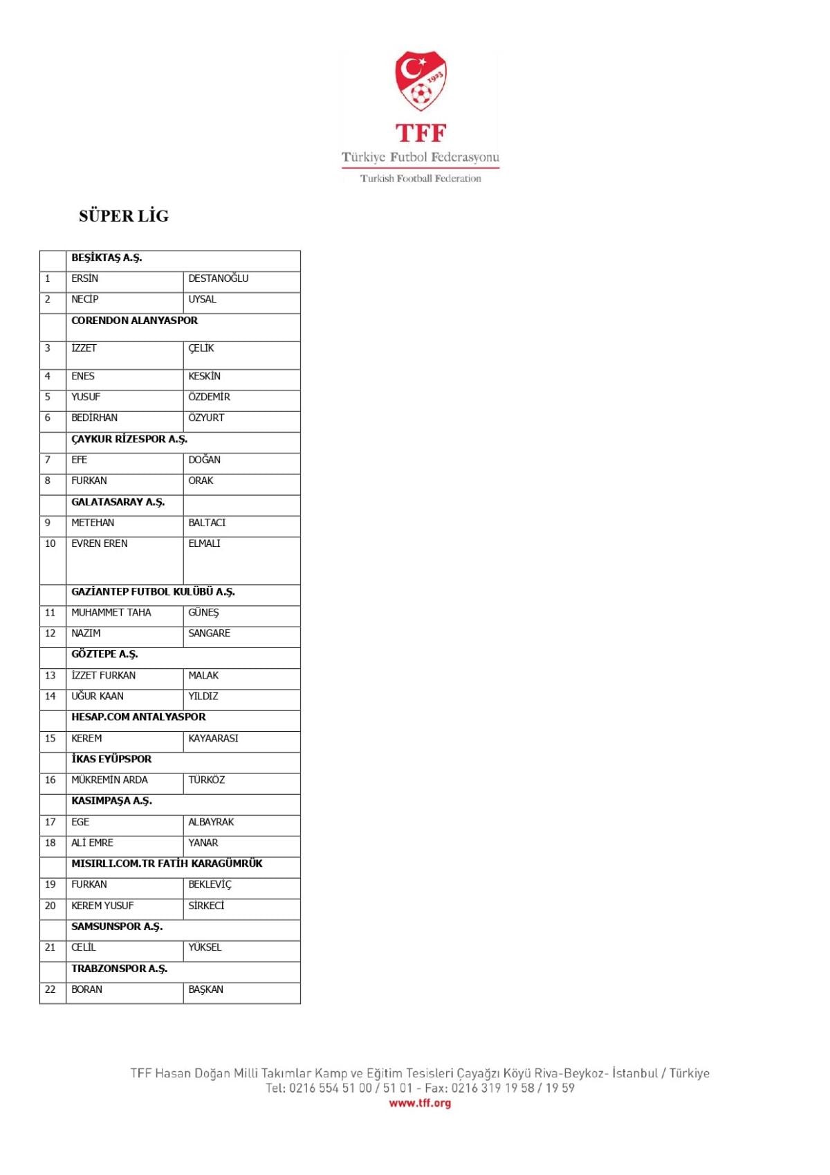 Sevk edilenler arasında Süper Lig'den 27 futbolcu yer aldı. TFF'nin açıklamasında 14 Süper Lig takımının oyuncusu tek tek duyuruldu.