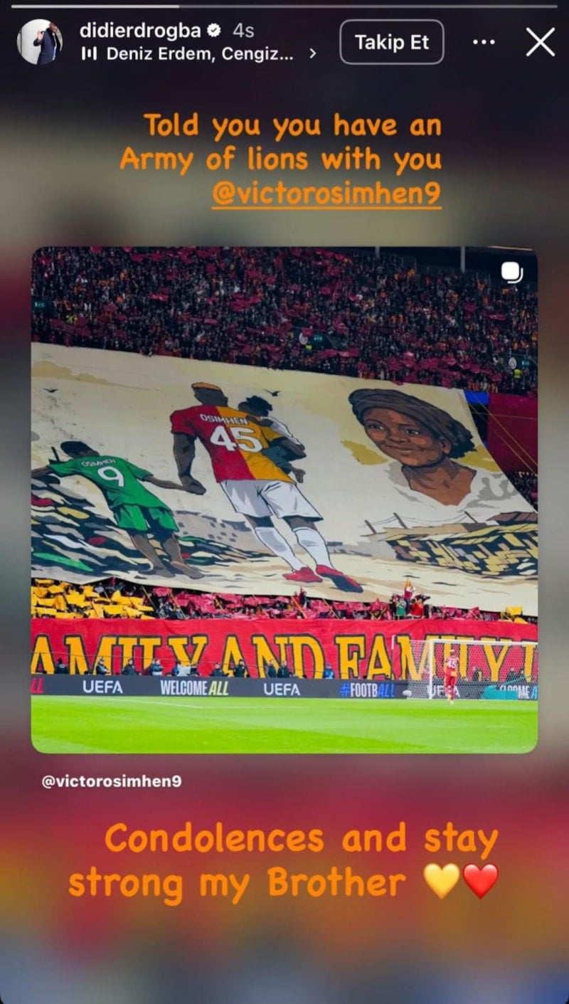 2013-2014 yıllarından Galatasaray formasını giyen Drogba, Osimhen'e "Sana yanında bir aslan ordusu olduğunu söylemiştim. Başın sağ olsun ve güçlü kal kardeşim" mesajıyla destek çıktı.