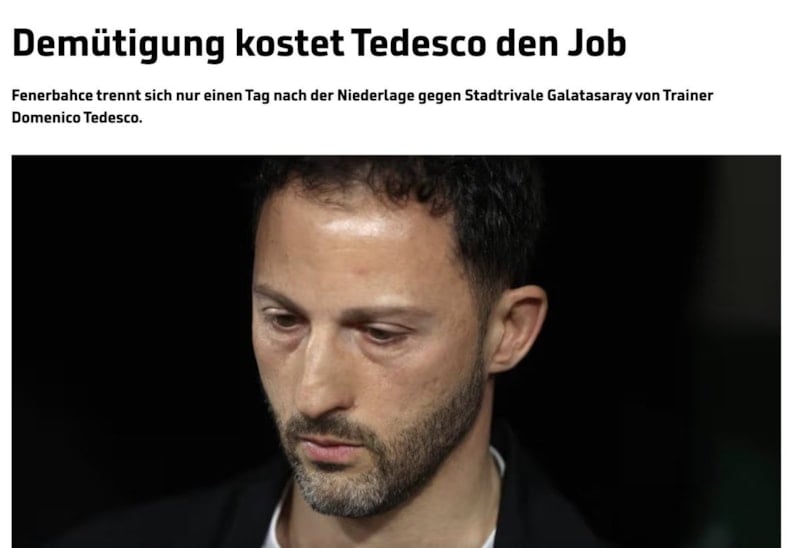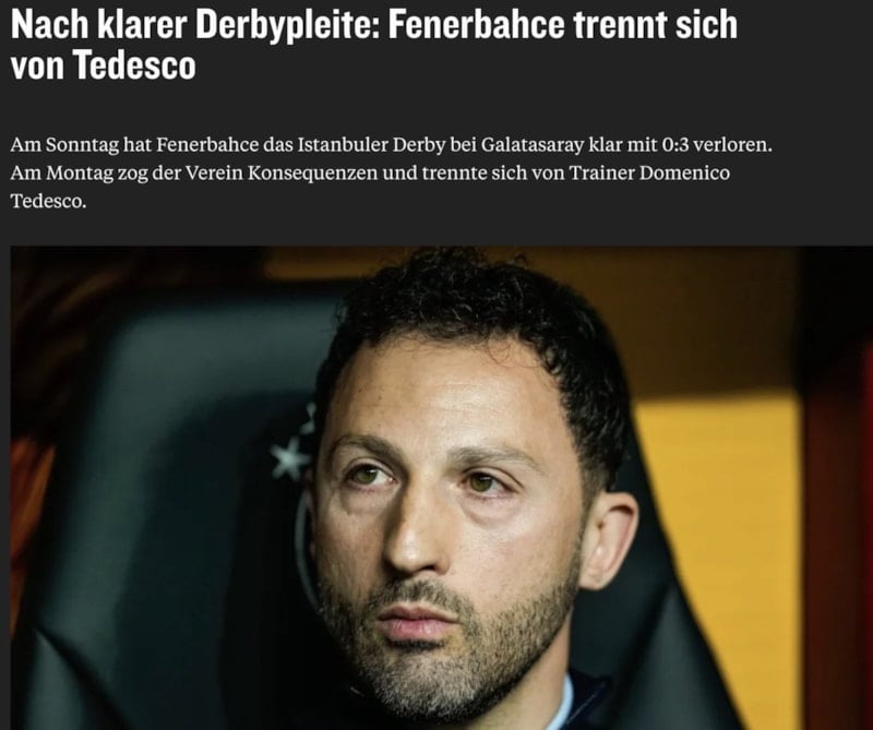 Fenerbahçe'de teknik direktör Domenico Tedesco ile yollar ayrıldı. Alman basını, bu ayrılığı Galatasaray derbisinde alınan yenilgiye bağlarken "Derbi mağlubiyetinin ağır sonuçları oldu" yorumunda bulundu.