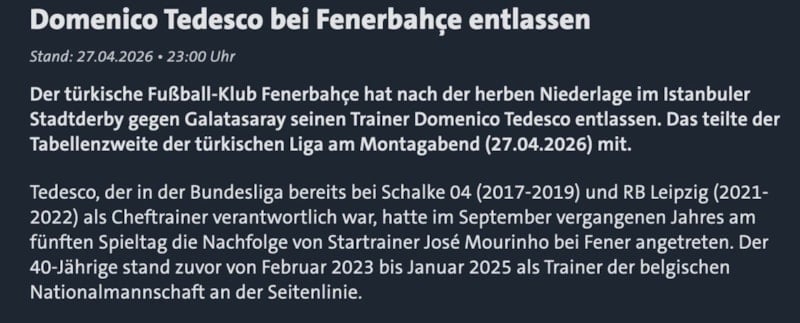 Sportschau ise haberinde, "Fenerbahçe Domenico Tedesco'yu kovdu. Fenerbahçe, Galatasaray'a karşı İstanbul derbisinde aldığı ağır yenilginin ardından teknik direktörü Domenico Tedesco'yu görevden aldı. Son dört sezonda Süper Lig'de ikinci sırada yer alan Fenerbahçe, pazar günü Galatasaray'a karşı oynadığı derbide 3-0 mağlup olduktan sonra, şampiyonluk şansı sadece matematiksel olarak kaldı. Ligde bitime üç maç kala, kulüp rekor şampiyon Galatasaray'ın yedi puan gerisinde bulunuyor." ifadelerini kullandı.