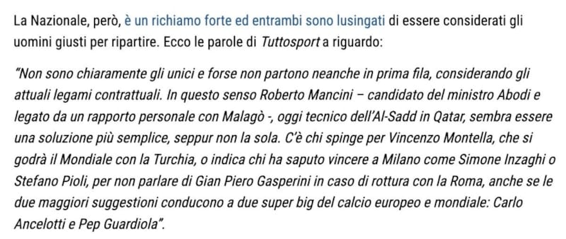 Ünlü İtalyan gazeteci Gianluca Di Marzio ise aklındaki ismin Massimiliano Allegri olduğunu ancak başarılı teknik adamın Milan'la sözleşmesinin sürdüğünü hatırlatarak, "Türkiye ile iyi iş çıkartan Vincenzo Montella'nın teknik direktör olmasını da memnuniyetle karşılarım" yorumu yaptı.