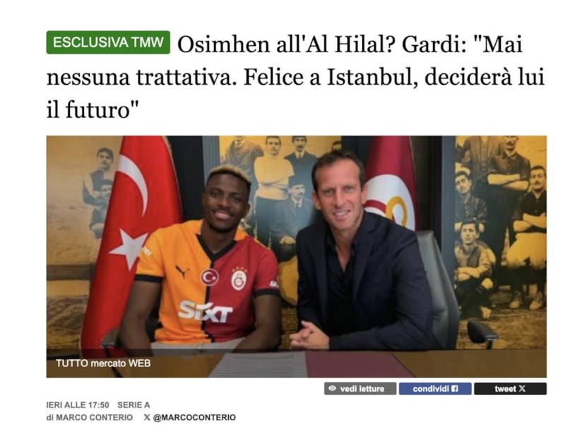 İtalyan basınından Tuttomercatoweb'e konuşan Gardi, sarı-kırmızılı oyuncunun adının Al Hilal ile anılmasının sorulması üzerine "Ne daha önce ne de şimdi hiçbir müzakere olmadı. Oyuncu söz vermişti: İstanbul'da tüm sezon kalacaktı ve sözünü tuttu. Hiçbir zaman herhangi bir çıkar düşünmedi." diyerek yanıt verdi.