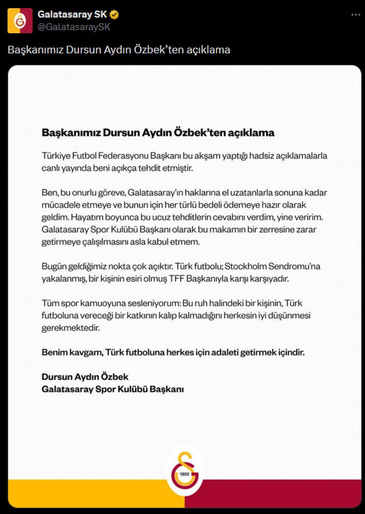 "Türkiye Futbol Federasyonu Başkanı bu akşam yaptığı hadsiz açıklamalarla canlı yayında beni açıkça tehdit etmiştir. Ben, bu onurlu göreve, Galatasaray’ın haklarına el uzatanlarla sonuna kadar mücadele etmeye ve bunun için her türlü bedeli ödemeye hazır olarak geldim. Hayatım boyunca bu ucuz tehditlerin cevabını verdim, yine veririm. Galatasaray Spor Kulübü Başkanı olarak bu makamın bir zerresine zarar getirmeye çalışılmasını asla kabul etmem.