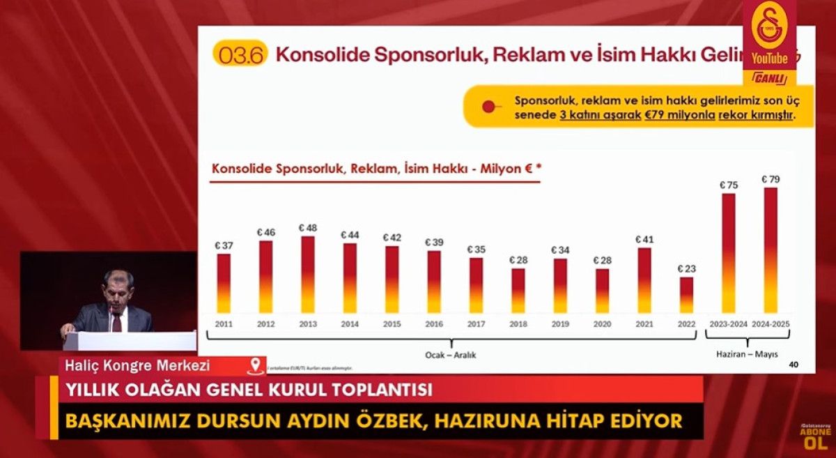 "Sponsorluk gelirlerinde 79 Milyon euro ile bir rekor kırdık. Futbol forma sponsorluklarında 28 Milyon euroya ulaştık. Geçen sene Avrupa Ligi'nde olduğumuz için UEFA gelirlerinde düşüş oldu. Bu sene Şampiyonlar Ligi'ne katılımla birlikte en az 40 Milyon €'luk gelir bekliyoruz. UEFA'nın yayınladığı mali raporda, Galatasarayımız ilk 10'da yer almıştır. Bu sene Şampiyonlar Ligi geliriyle çok iyi mali tablolar ortaya çıkacak."