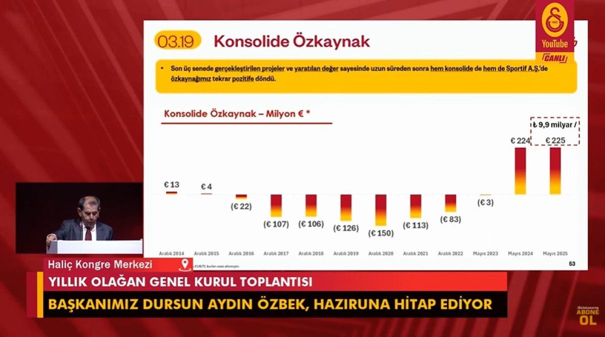 "Futbol faaliyetlerimiz için yeterli gelirimiz önümüzdeki yıllar için de var. UEFA tarafından sürekli denetleniyoruz. En büyük denetçimiz UEFA, üç ayda bir raporluyoruz. Sportif faaliyetlere devam etmemizin tek koşulu raporlamanın UEFA tarafından kabul edilmesi... Bu kriterlere uymazsanız, TFF ve UEFA nezdinde faaliyetlerinize devam edemezsiniz. Ayrıca UEFA her sene, her ülkeden bir kulübe detaylı inceleme yapıyor. Didik didik ediliyor... Geçen sene Türkiye'den bizi seçtiler. Bu denetimden kusursuz geçtik. Galatasaray, sürdürülebilir endeksinde yeşil kategoriye yükseldi. Çok önemli görüyorum. Bu durum, son dönemdeki tartışmalara da ışık tutacaktır."