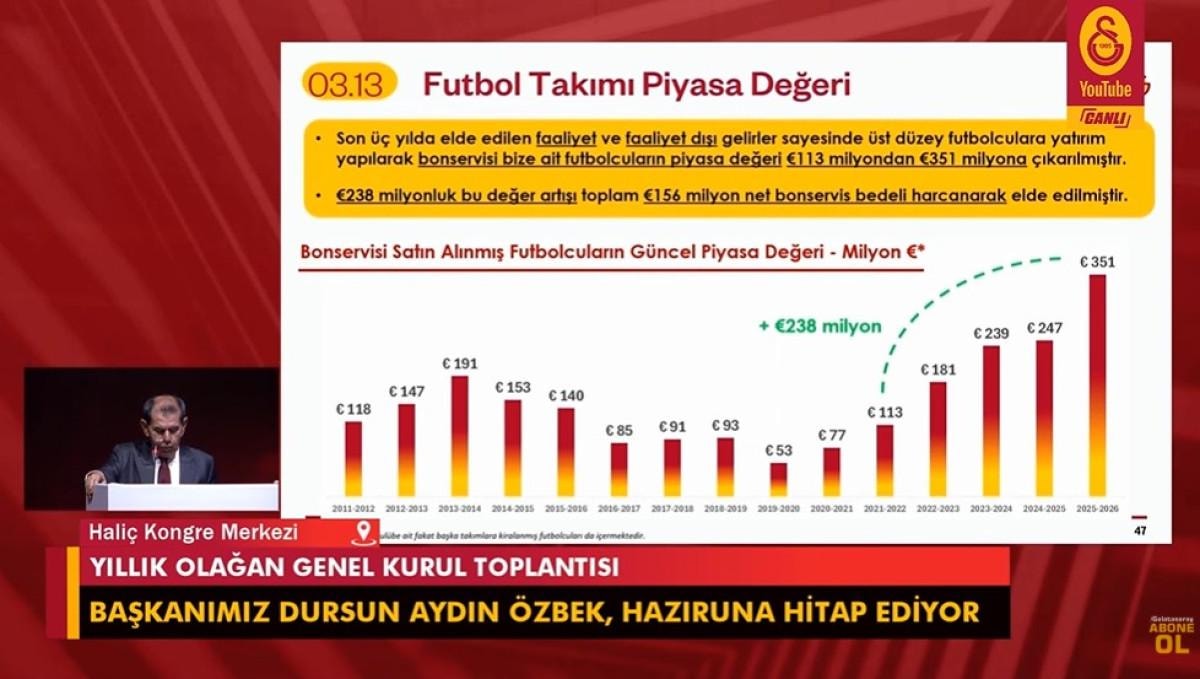 "Son dönemde kadroya katılan oyuncular önemli bonservisler ödendi. Bu durum brüt karı olumsuz etkiledi. Bu rakamlarda kiraladığımız oyuncular yok. Geçen sene kiralık oynayan Osimhen'in değeri geçen seneye dahil değil, ancak Zaniolo'nun piyasa değeri bu tabloya dahildir. Türkiye'nin açık ara en değerli kadrosunu kurduk. 238 Milyon €'luk kadro değerinde artış oldu. Rakiplere de örnek olduk. Onların da iyi futbolculara yönelmesini sağlayacak Türk futboluna hizmet ettik."