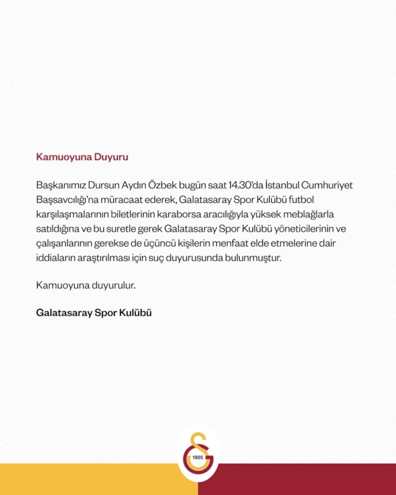 Galatasaray Kulübü, Başkan Dursun Özbek'in karaborsa bilet iddialarıyla ilgili İstanbul Cumhuriyet Başsavcılığı'na suç duyurusunda bulunduğunu açıkladı.