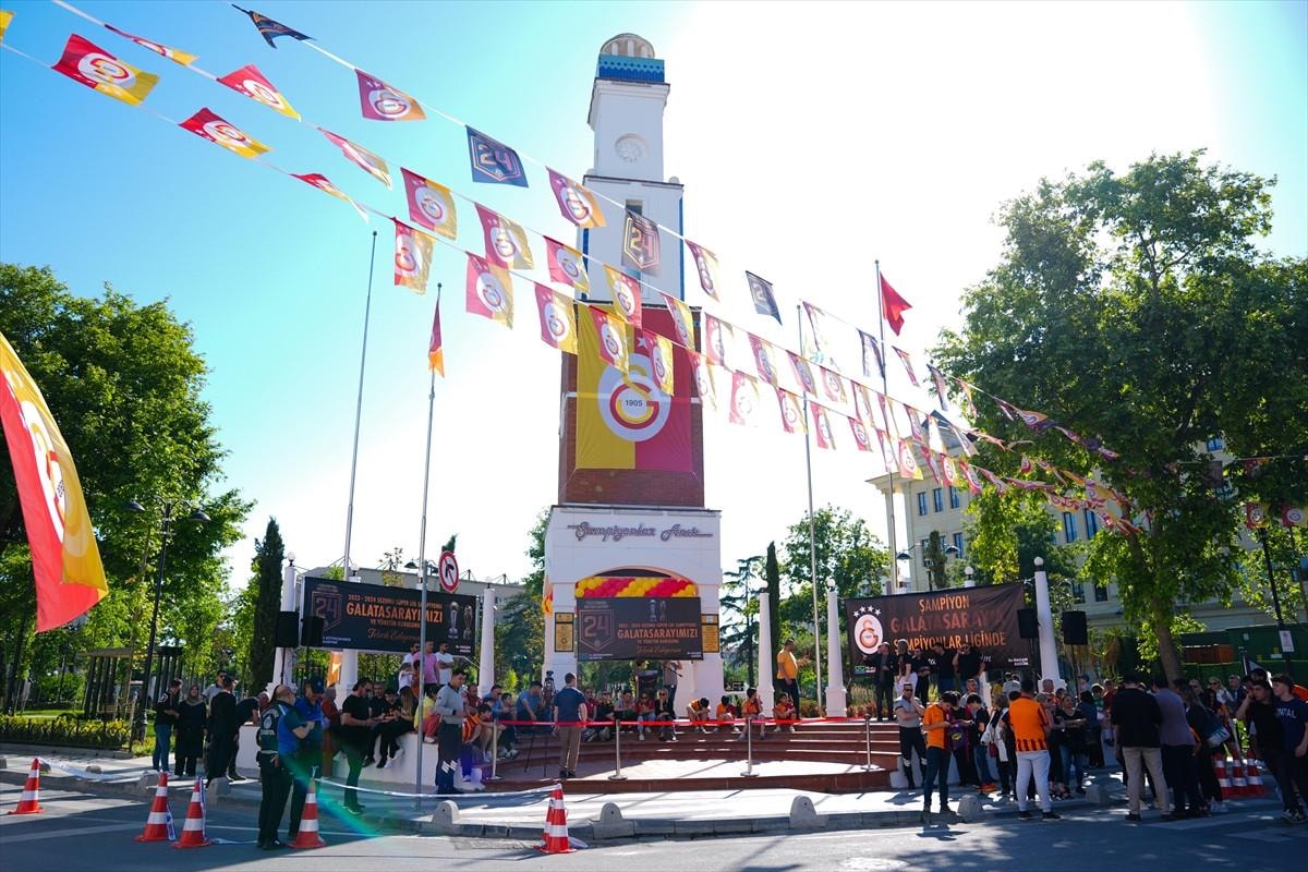 İstanbul'un Büyükçekmece ilçesinde bulunan ve her yıl şampiyon olan takımın bayrağının dalgalandığı Şampiyonlar Anıtı'na Galatasaray Genel Sekreteri Eray Yazgan ile birlikte gelen başkan Dursun Özbek'i Büyükçekmece Belediye Başkanı Hasan Akgün karşıladı.