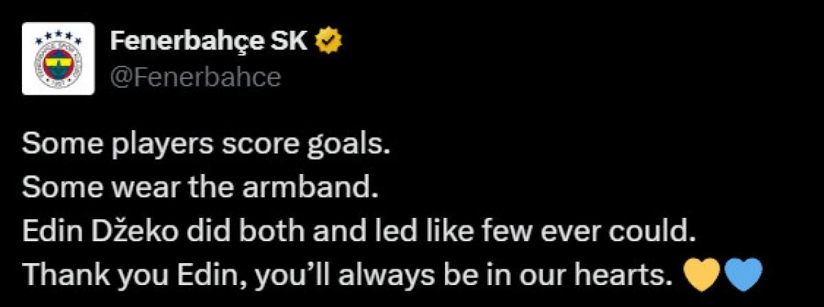 Fenerbahçe'nin kaptanı Edin Dzeko, sosyal medya hesabından yaptığı paylaşımla sarı-lacivertli kulüpten ayrıldığını duyurdu.