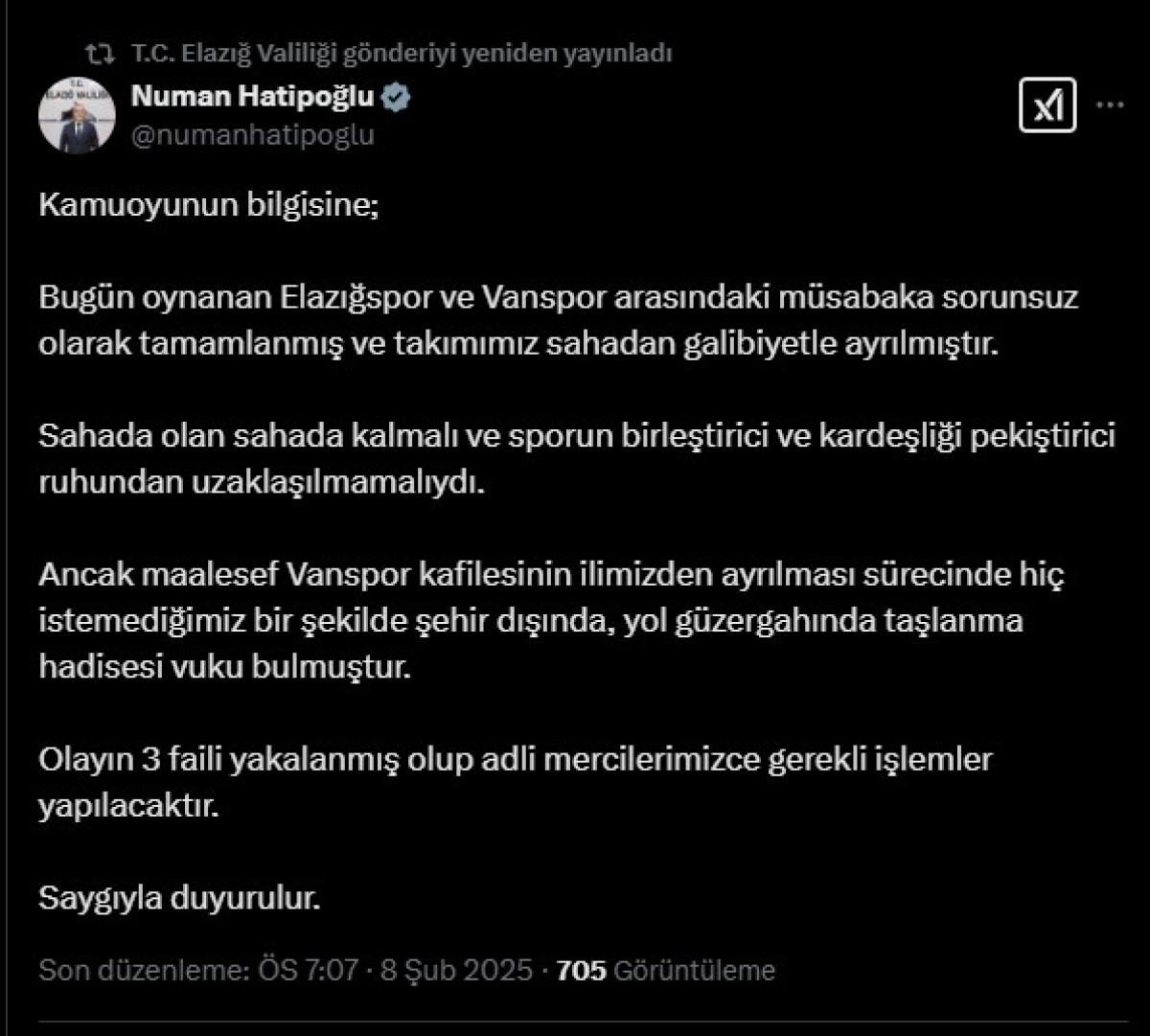 Bugün oynanan Elazığspor ve Vanspor arasındaki müsabaka sorunsuz olarak tamamlanmış ve takımımız sahadan galibiyetle ayrılmıştır. Sahada olan sahada kalmalı ve sporun birleştirici ve kardeşliği pekiştirici ruhundan uzaklaşılmamalıydı. Ancak maalesef Vanspor kafilesinin ilimizden ayrılması sürecinde hiç istemediğimiz bir şekilde şehir dışında, yol güzergahında taşlanma hadisesi vuku bulmuştur. Olayın 3 faili yakalanmış olup adli mercilerimizce gerekli işlemler yapılacaktır. Saygıyla duyurulur.